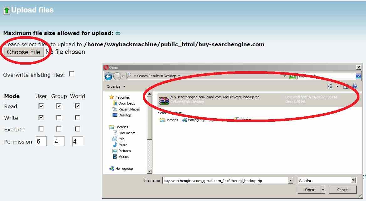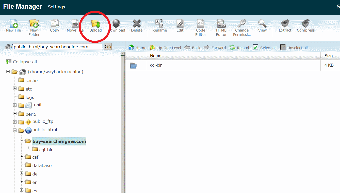 - 3. Browse to the root folder of your domain. Normally this is /public_html/example.com, as shown below. For this tutorial, we used the domain buy-searchengine.com. Then click on "Upload":