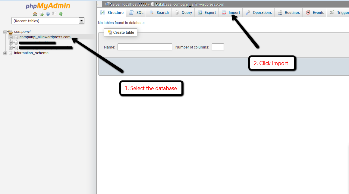 - 7. First select your database on the left panel, by clicking on it. Then click "import" and import the database. This is the .sql file in the folder called "database".
