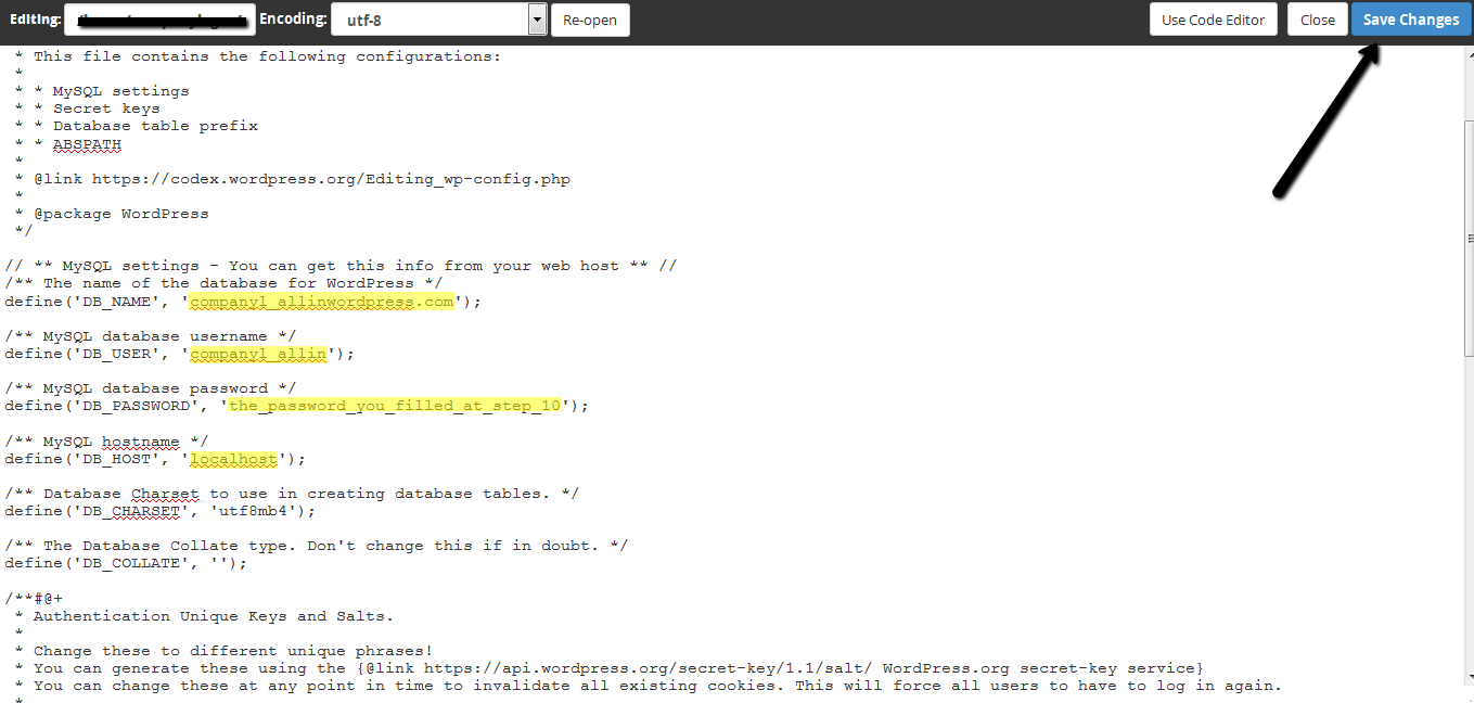 - 8. Go to File Manager and find the file called "wp-config.php". Open this file in a text editor.