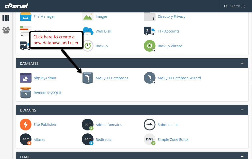 - 2. Go to your cPanel and open "MySQL Databases". Create a new database. You can name it anything, but in our example we use the name of our domain. You will need this name later, so pick something easy.